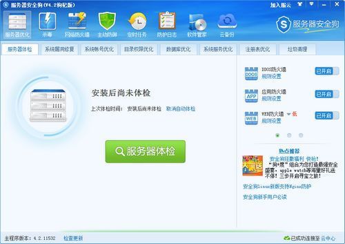 服务器安全狗是为IDC运营商、虚拟主机服务商、企业主机、服务器管理者等用户提供服务器安全防范的实用系统,是一款集DDOS防护、ARP防护、查看网络连接、网络流量、IP过滤为一体的服务器工具。作为服务器安全专家,这套软件已通过公安部信息安全产品检测中心的检测,并获检验合格证书。