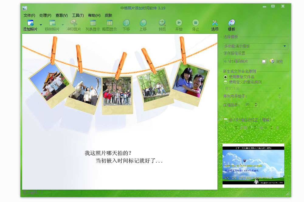 简单说,这是一个给数码照片添加日期标记的软件。数码相机拍摄的照片,一般不直接在照片上显示拍摄时间,只是存储在图片文件的Exif信息中。本软件可自动读取照片的Exif信息得到拍摄时间,然后根据您的设定使其显示在照片上。只需要点几下鼠标,即可把您所有的数码照片批量加上拍摄时间和文字描述。本软件不仅能够显示照片的拍摄时间以及普通文字,还可以显示宝宝的年龄。看到自己的宝宝一天天长大,是一件多么开心的事情啊!