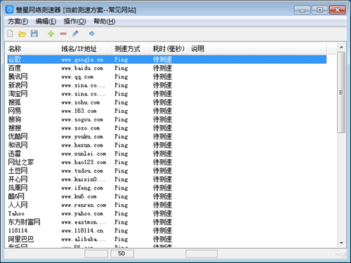 一款测试网络连接速度功能的工具。可编辑的目标地址列表,可保存目标地址列表方案,支持测试方式选择。软件彻底免费,无广告,采用同时对多项并行测速的工作方式,省时快捷。