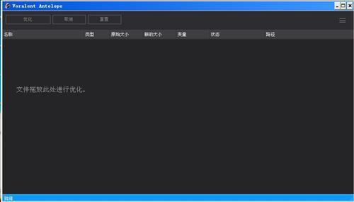 Voralent Antelope是一款批量图片压缩优化工具,并且能在不损坏图片的前提下压缩优化图片。能在不改变图片分辨率且尽量不损耗清晰度的前提下让图片文件体积变得更小,以便在网络中传输得以加快。把你要压缩的图片拖入软件框中,然后点击优化。