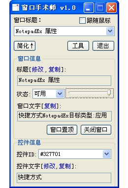 小巧的控制窗口的好工具。它不但可以轻松复制窗口的文字、标题,还能获取窗口内控件的文本。除了简单的查看功能,它还可以对窗口进行完全的修改。修改标题、改变透明度、改变窗口状态(隐藏、显示等等)、将窗口置顶、修改窗口内控件的文字……总之,在窗口手术师的刀下,你可以随心所欲地控制窗口。