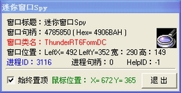软件运行后能够实时显示当前鼠标所在位置的窗口的相关信息,包括窗口标题、窗口句柄、和窗口类型以及窗口进程ID,程序小巧实用且支持置顶显示。