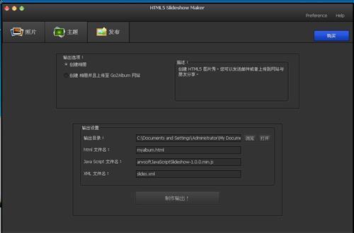 HTML5 Slideshow Maker 虽然没有中文界面,操作没什么难度,载入要制作幻灯片相册的照片,目前提供了四种相册模式,每一种模式都是三种颜色,然后通过调整相册宽度、高度、背景色、名字等,完成后选择输出就搞定!如果你有网站空间可直接上传分享。