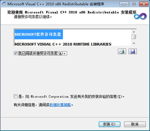 Visual C++ 库安装必要的运行时组件。使用户能够在未安装 Visual C++ 2010 的计算机上运行使用 Visual C++ 开发的应用程序。