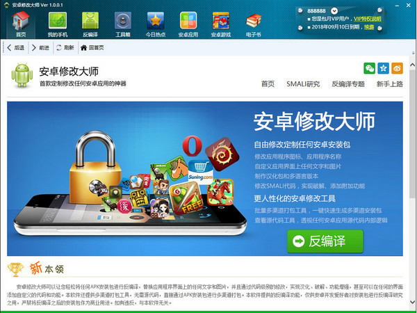 安卓修改大师可以让您轻松将任何APK安装包进行反编译,替换应用程序界面上的任何文字和图片,并且通过代码级别的修改,实现汉化、破解、功能增强,甚至可以在任何的界面添加自定义的代码和功能。本软件还提供多渠道打包工具,无需源代码,直接通过APK安装包进行多渠道打包。本软件提供的反编译功能,仅供安卓开发爱好者对安装包进行反编译研究之用,严禁将反编译之后的安装包作为商业用途。如有违反,与本软件无关。本软件需要您的电脑安装了 .Net Framework 4.0以上版本和JDK1.8以上版本方可正常使用。