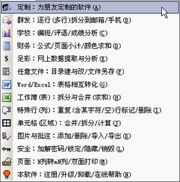 集成了25个方面,100余项功能的Excel实用工具。对于Excel2003以下版本,将在菜单栏上增加一个“新增工具”菜单;对于Excel2007及以上版本,将在菜单栏上的“加载项”下增加一个“新增工具”菜单。功能主要包括:工作薄、工作表、表中记录(组)之间的转换、Word与Excel之间的表格转换、创建目录与批量改名、教学成绩统计与分班、财务数据计算和发送工资条到邮箱与手机足彩分析等。