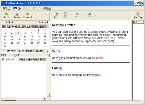 一款不错的桌面日记本,不论是拿来写日记,还是写些简单的每日计划,都非常适用。RedNotebook包含一个日历导航系统,支持自定义模板,支持导出,支持标签云来管理和整理你的日记,便签等。你也可以对你输入的内容排版,添加标签,支持搜索;也支持在日记中插入图片,链接,自动转换网址和信箱地址为链接,支持自动保存等多个功能。