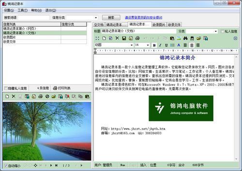 一款图文信息记录管理软件,它能帮您记录保存文本、网页、图片及各类文件。可以快速地对信息库内的信息进行全文搜索,查找出您所需的信息。可以浏览、保存网页;软件内嵌Internet浏览器,支持多页浏览;用户可同时开启多个网页,浏览并保存收录。可以收录图片和任何文件;JPG、BMP、GIF、PNG、WMF等图片直接显示;可收录任何格式的文件作为信息附件。可以设定信息的分类,信息类别可进行多级分类,上下级类别具有从属关系。