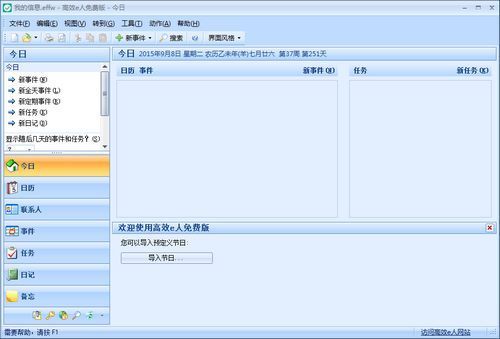 一款个人信息管理软件。它能分门别类管理您的联系人、通讯录及客户信息,增强人脉关系;能制订日程安排和任务计划,跟踪节假日、生日及纪念日,并能按您的要求及时提醒,让工作和生活井井有条;直接书写电子日记,记录点滴心情;通过高效 e人内置强大的文档编辑器,书写和记录各种备忘、笔记等文档;通过桌面便笺,您随时不会错过重要信息;密码管理器能安全地记录和查找各种密码;网址收藏夹能记录登录网页的用户名及密码等信息;专为中国人设计,全面支持农历、节气、拼音首字母等功能。 高效e人更好地管理您的时间和人脉,现在就加入快乐、高效、成功的高效e人阵营!