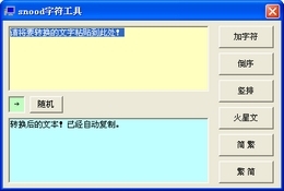 snood字符工具是一款非常不错的字符处理工具,它可以帮您处理包括随机添加字符、倒序、竖排文字。例如将文字转换成火星文,繁简转换等。snood字符工具是纯绿色软件。