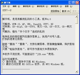 用来解读乱码的小工具。可解读:HTM--U,QP,URL,Base64,UTF7,HZ;可转换:GB--Big5,GB--UTF8,英文--GB,GB--日文,GB--韩文等;可解决:错失“半个汉字”造成的乱码。每种乱码的特征都列在操作菜单上,供用户对号入座。打钩的是常见种类。能够“撤消”“重做”,支持右键菜单,限制键盘编辑,保护原始文本。只要“粘贴作原始”,即可作为原始文本得到保护。