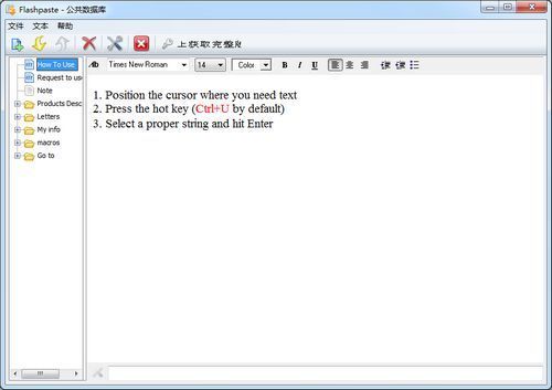 Flashpaste是一款类似于剪贴板的工具,可以帮助你快捷地粘贴常用的一段文字、问候、格式文本、电子邮件地址、网络地址、用户名和密码等。运行后在后台监视剪贴板的文本并加入数据库。在需要粘贴文本时按下“Ctrl+I”快捷键后在弹出的窗口中选择文本即可粘贴到光标位置上。