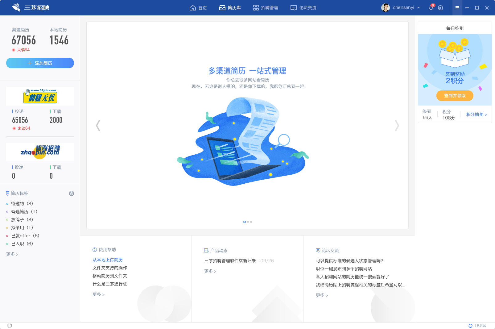 三茅招聘管理软件是一款免费的、实用的招聘管理工具。帮助HR高效管理多个招聘渠道的简历,轻松搭建海量人才库。支持与用人部门协作筛选简历,招聘效率倍增。