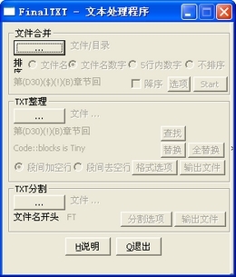 文本合并、整理、分割和搜索工具。支持合并3000+个文本文件,每个大到4M,文件名排序;整理分割不限文件大小。可选定每行字数;支持多字符串特征搜索,支持ASCII字符,支持目标子串替换;按字数,或特征字符串分割文件,有丰富的分割文件命名方式。