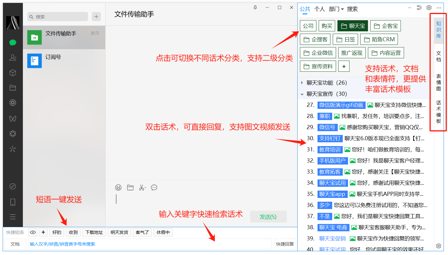 一款智能客服客服工具。针对IM客服(QQ,TM,旺旺)日常工作中,回复量大,重复的特点,提供了基于知识库的快速选择答案的功能。 帮助客服高效方便地处理日常工作中的琐碎事项,提高工作效率。聊天宝启动后,会吸附显示在IM的右侧和下侧,选择右侧的知识库,即可发送回复,下侧吸附的操作界面中,通过了检索功能,可以通过关键字或者拼音,检索需要回复的知识库。