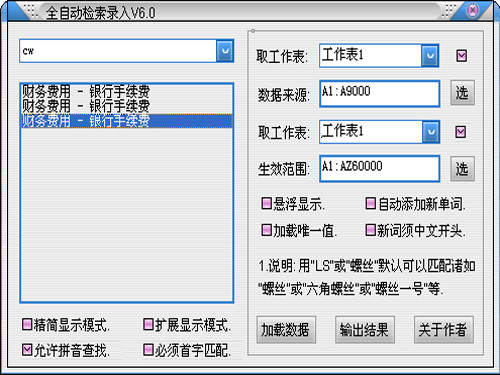 Excel全自动检索录入,又名逐步提示录入工具箱。能与EXCEL智能交互操作与加载内容之间相互传递,查询与录入支持纯键盘按键操作,支持所有常用GB2132中文汉字库以及大部分生僻汉字的拼音检索。当输入查询内容时,能边录入或修改即时自动检索出结果显示并方便用户快捷可选性录入其中某项记录。人性化地操作与逐步结果提示,支持中文和拼音字母检索,高效的检索算法能即时极速地检索出结果。若出现未能检索出结果的新单词时,只需按一下回车键,它就会自动追加到词库中去与历史查询记录中。检索出的结果内容还能是否按用户指定的存储格行列或生效范围中进行录入,防止可能的误录入操作。支持是否忽略隐藏行的数据加载,支持录入数据时是否启用自动换行,录入数据时更加灵活与快捷。可取区域数据为唯一值,提高录入效率。可对班员姓名、产品名称、会计科目、摘要信息、英文等检索,广泛应用于办公、选择性数据录入应用。拥有4款漂亮的皮肤界面,其功能更与EXCEL交互操作融为一体。