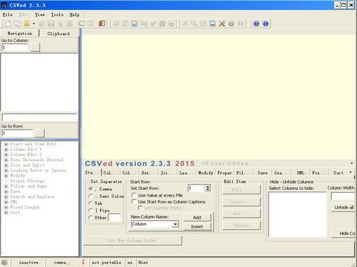 小巧而强大的CSV文件编辑工具。可将CSV文件的内容展现在一个列表浏览窗口中,可方便地进行编辑、添加、插入、排列、删除和移动项目等操作,就像在数据库表格中操作一样。此外,软件还具有删除副本、修复文件、使用内置搜索功能寻找指定记录等功能,支持搜索和替换,支持导出为XML文件。