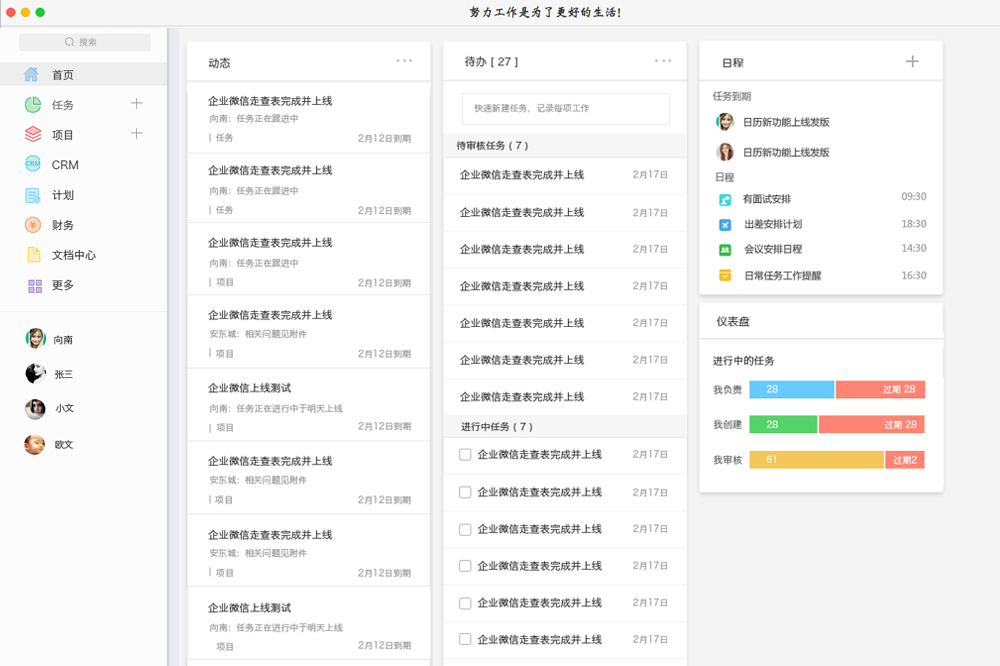 个人、团队和企业的高效工作平台,提升工作执行力!任务协作:随时记录和跟进每一项工作,个人记录待办工作,快速分派工作给同事;工作计划:按周、月或季度计划个人和团队的工作,适合周会、月会场景;同事支持目标设定和管理;项目管理:替代project的协作项目管理工具。脑图(思维导图)快速分拆项目任务,甘特图规划时间,项目成员时时更新进度;软件敏捷开发管理:产品、研发和测试的一体化工具,支持需求、缺陷、版本、迭代管理和功能强大的看板;CRM:轻量级销售管理工具,客户、商机、订单、合同管理;日程:个人和团队日程管理和共享;企业IM:类企业微信的团队和企业内部聊天工具;OA:文档中心管理团队和企业文档, 财务和人事审批(自定义流程),考勤和外勤管理;支持日报、周报、月报的工作总结;