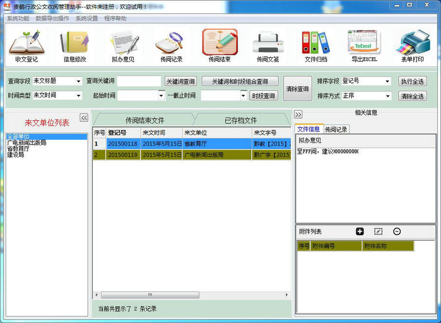 贵鹤行政公文收阅管理系统是专业行政公文收文快速处理软件,专为行政企事业单位行政管理文秘人员开发,能有效提高收文处理效率,节约人力成本,将单位行政办公进一步现代化。该软件最大特色是能批量打印文件传阅单(来文处理笺),并且有数据加密功能、一键备份和导入功能,确保了办公数据的安全可靠与收文处理的高效。