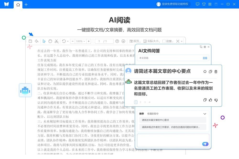 一款免费支持PDF转换和PDF编辑,能打开200多种文件格式的PDF阅读器。 【全新上线】-PDF编辑功能: 轻松修改PDF文字与图片,小巧便捷 - 全文翻译功能:支持Ai翻译、DeepL翻译、学术翻译,三巨头联手,让语言不再是障碍! - 文档问答功能:快速总结,高效总结文档要点,深度解读内容精华,每个疑问都能得到精准回答! 免费支持PDF转Word,PDF转PPT,PDF转Excel,PDF转图片,Word转PDF,Excel转PDF,PPT转PDF,图片转PDF,PDF拆分合并,PDF压缩,PDF加密解密,PDF添加水印,PDF删除水印,PDF提取/删除页面等功能。支持PDF、Mobi等常用阅读文档格式和图片格式以及多种开发语言文档。
