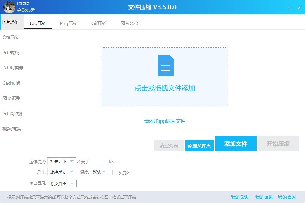 操作简单,功能实用的文件压缩软件!一键式操作、多种格式压缩、支持批量操作、压缩质量可调节, 有效解决文件过大难题!目前支持jpg,png,gif等图片格式文件压缩与转换。还支持pdf,word,ppt等格式文件压缩