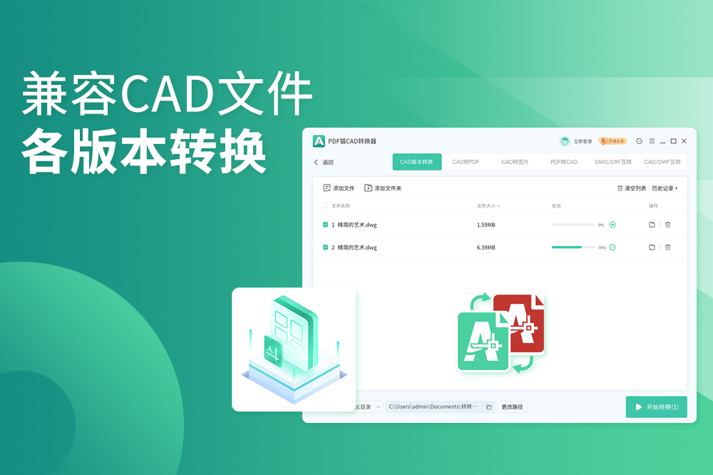 PDF猫CAD转换器支持CAD文件格式转换功能,支持将PDF转CAD,CAD转PDF,CAD版本转换,CAD转图片,CAD转DWF,DWG/DXF格式互转功能,转换后文件格式还原度高,转换后文件可编辑,并兼容XP/Win7/Win8/Win11等系统电脑都能完全兼容。 重点功能 CAD格式文件转换 • 支持PDF转CAD/CAD转PDF/CAD版本转换等常用CAD文件格式转换功能 • 转换后的CAD文件于原文档内容排版保持一致,还原度高 批量文件转换 • 支持批量CAD文件格式转换功能 • 批量拖拽文件功能,一键批量转换CAD文件 CAD版本互转功能 • 支持CAD高低版本互转功能