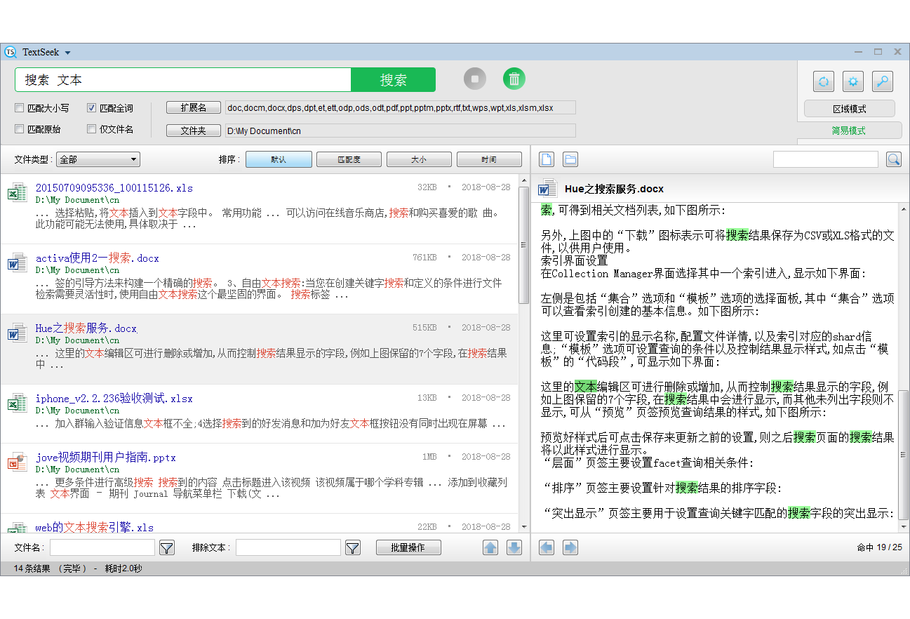 操作简单,像百度一样,输入关键字即可搜索,右侧还可预览关键字高亮的文件内容。支持正则表达式。