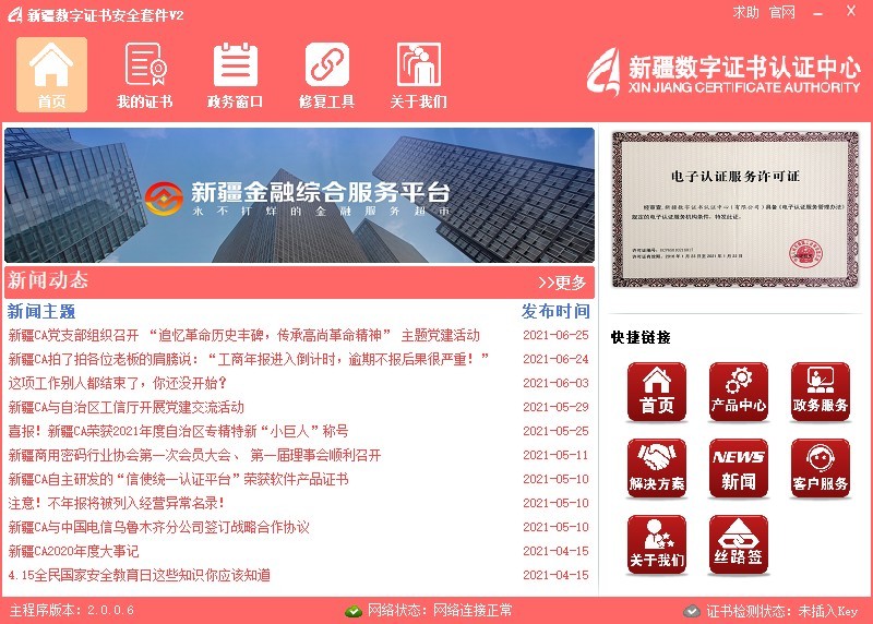这是一款提供给新疆数字证书认证中心颁发的数字证书用户使用的软件,软件可查看证书信息,延期证书、修改证书PING码等功能