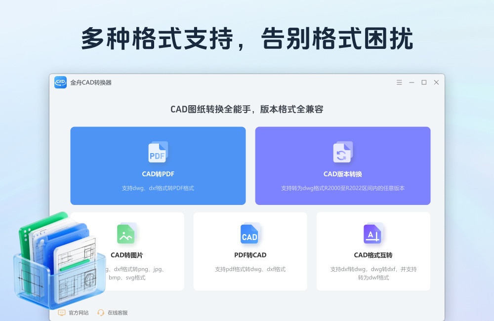 CAD版本转换,CAD转PDF,CAD转图片,PDF转CAD,图片转CAD,DWG DXF互转,CAD DWF互转;金舟CAD转换器是一款CAD文件转换处理软件, 操作简便,软件界面简洁明了,可一键批量一键操作;转换速度快,为CAD文件工作者提供便捷的CAD文件处理方案,更效率办公,本地完成转换,更安全。