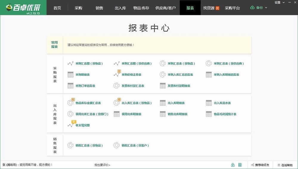 百卓优采云进销存软件可辅助小微企业高效完成采购管理、库存管理及销售管理工作!软件包含物品、供应商、客户、项目等基础信息管理,同时覆盖采购管理、付款和发票管理、销售管理、出入库管理、库存管理、财务管理等核心环节!软件支持数据批量导入和快捷调用,可一键生成专业采购和库存报表,各单据支持自定义模板及快捷打印。