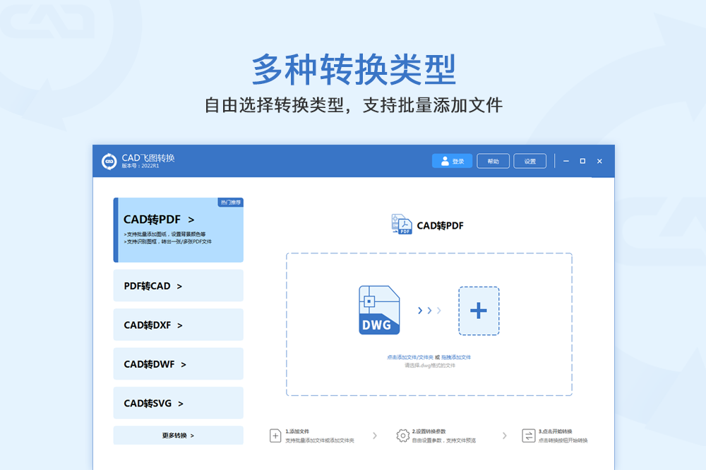 CAD飞图转换是一款简单易用的CAD全能转换工具,只需添加文件、设置转出参数、点击转换即可完成转换。支持多种类型的转换。如:CAD转其他格式,包含CAD转PDF、CAD转图片、CAD转DXF、CAD转DWF、CAD格式互转和CAD转SVG等;识别图框批量转,包含批量转PDF和批量转图片;其他格式转PDF,包含PDF转CAD、天正转T3、DXF转CAD、DWF转CAD等。支持批量添加文件、支持自由设置转出参数、支持文件预览,轻松完成转换。