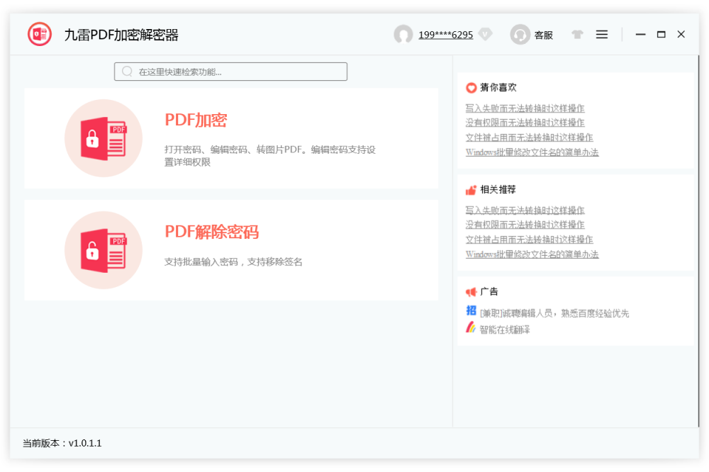 九雷PDF加密解密器,专为PDF加密和PDF解密设计。批量PDF加密、PDF解密工具软件。