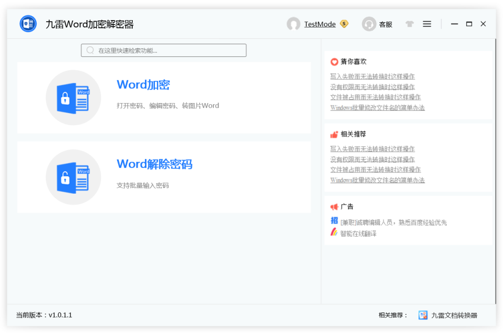 九雷Word加密解密器,专为Word文字doc和docx加密解密设计。批量Word加密、Word解密工具软件。