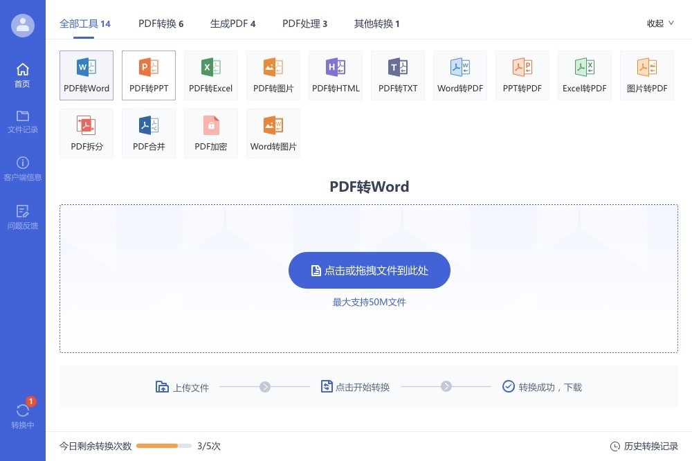 支持PDF转换、PDF处理、图片转换等多种类型的转换方式,为了保护用户的隐私安全,文件上传采用SSL加密传输,可随时删除文档相关记录,无人能阅读和下载这些文件,100%保护您的文档隐私。同时给予每个转换文档单独极速转换线路,保证转换质量,极大缩短文档转换用时,提高你的办公效率。