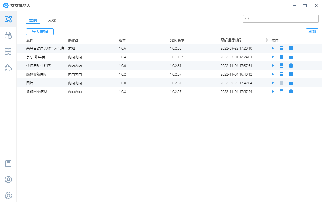 友友机器人用于执行自动化流程,支持全/半自动完成重复工作的运行工具。 定时或手动触发,灵活运行自动化流程机器人 7*24 无人值守自动执行工作 支持半自动模式,与机器人助理协同完成工作 多种触发方式,定时执行任务 配合控制台,云端集中控制、批量调度