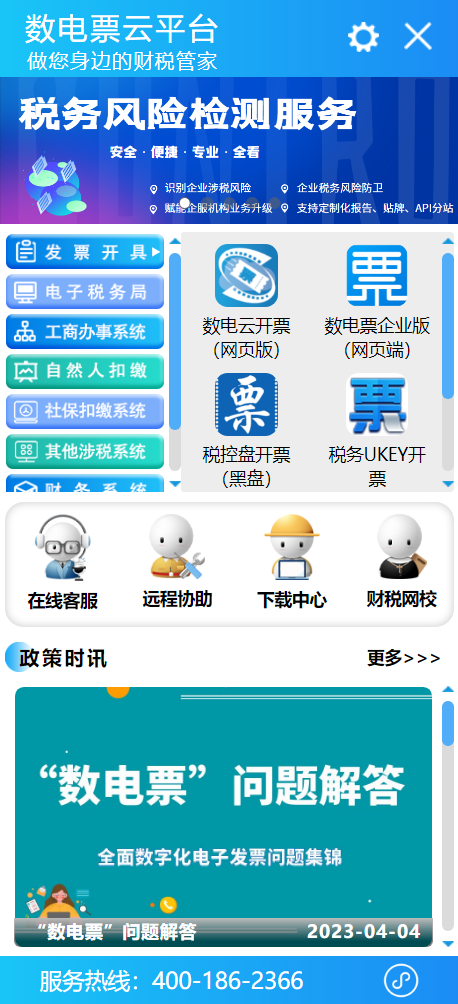 金财易税服务平台是一个综合性的财税服务平台,平台通过整合各企业常用的开票软件、报税软件、纳税申报服务平台、财务记账工具、工商办事平台等,实现企业经济业务全周期一站式解决。从纸票到电票,再到全电发票;从开票到勾选认证,再到纳税申报;从人事人员变动到社保费缴纳,再到网银管理端;从工商注册到工商年报,再到变更营业执照等等,只需一个平台就全部搞定。