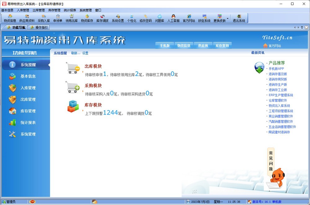 易特物资出入库管理系统是一款专业的针对企业内部单位库存管理,针对内部申领,领用出库,工具领用移交等,其中包含库存管理系统(仓库管理系统),报表系统等子模块。软件界面设计简洁,美观,其人性化的软件流程,使普通用户不需培训也能很快掌握软件操作使用方法,上手极易。