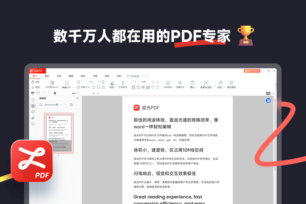 追光PDF是一款全能的PDF神器,它能提供良好的阅读体验、准确的文字图形渲染、极佳的注释交互操作、简单流畅的编辑功能、全能精准的PDF转换,无论是PDF转word、excel、ppt、图片、长图、CAD、扫描件、双层PDF,还是PDF进行各种处理:拆分、合并、压缩,亦或是其他格式譬如OFD转PDF等,都能在追光PDF上轻松实现。