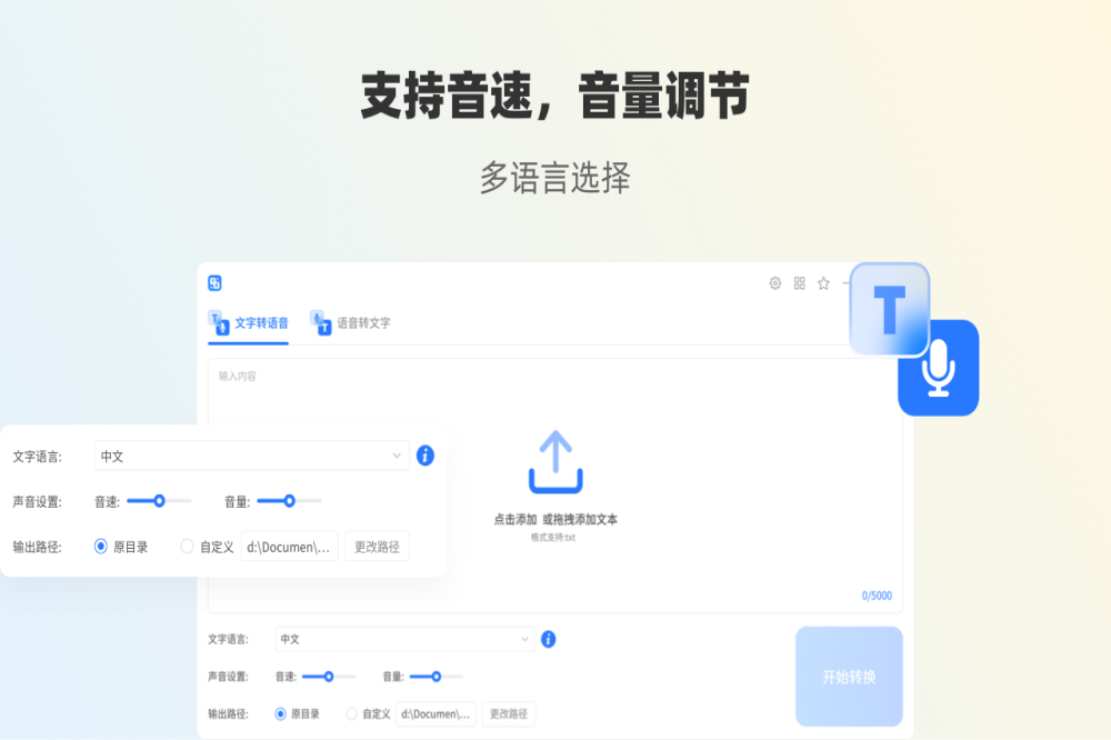 文字转语音转换器是一款支持文字语音互相转换的工具软件。它提供了2种功能模块,第一种就是文字转语音功能,导入文档内容,完成相应的参数设置就可以转换成相应的语音文件了;第二种就是语音转文字功能,导入录音,语音文件后,便可以转换为文字了,提供了多国语言选择。