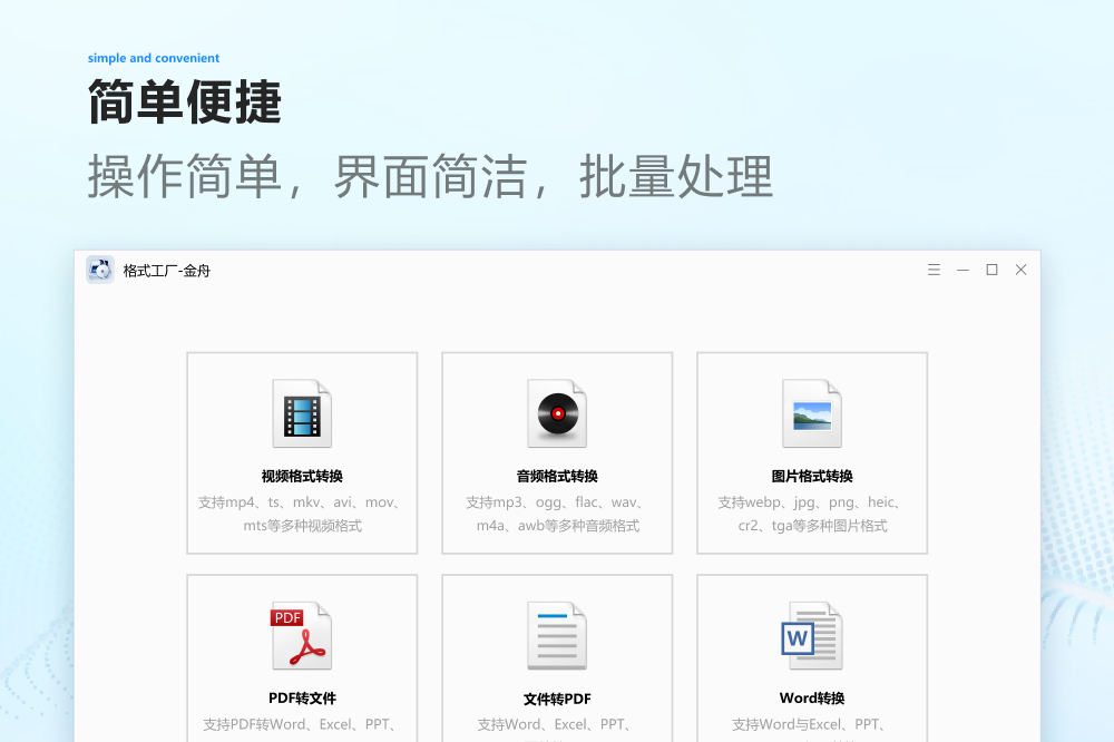 金舟格式工厂(JinZhou Format Factory)是一款多功能的文件转换工具,