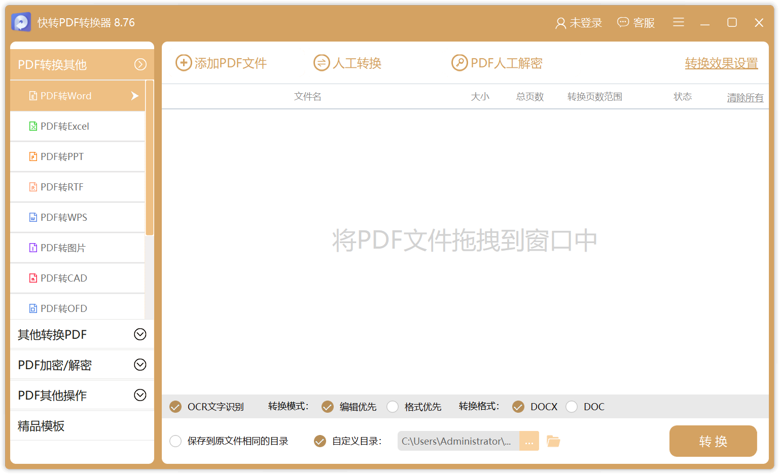 快转PDF转换器是一款专业的pdf转换器。支持PDF转WORD、PDF转Excel、PDF转PPT、OCR文字识别功能。支持PDF和office、wps、cad之间的转换,支持PDF文件加密、解密、拆分、合并等功能。快转PDF转换器,一款多功能PDF格式转换器。