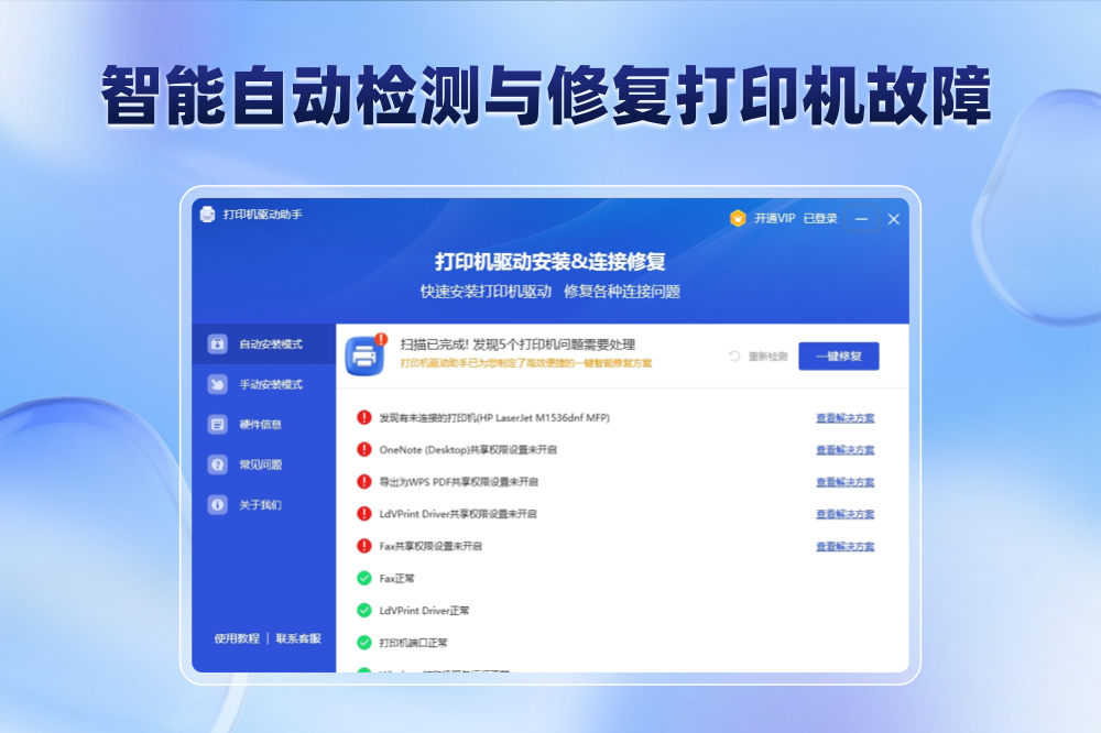 打印机驱动助手支持一键智能检测,自动识别打印机品牌、型号,一键智能下载/安装/修复最佳的驱动程序。同时也可可修复各种因为打印机驱动损坏及打印机系统服务异常引起的打印机无法连接、脱机,无法正常使用等问题。