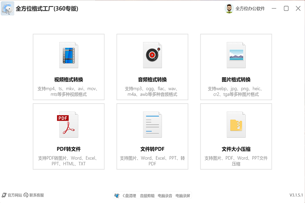 一款免费,视频转换,音频转换,图片转换,PDF文档转换,文件转pdf,文件压缩。 全方位格式工厂是一款文件格式转换集合软件,包含功能如下 视频格式支持:MP4、AVI、3GP、WMV、MKV、FLV、VOB、MOV、SWF、RM等等 音频格式支持:MP3、WAV、OGG、FLAC、MP2、M4A、M4R、AC3、MMF、WMA等等 PDF文档支持:PDF转Word,PDF转Excel,PDF转PPT,PDF转图片JPG,PDF转HTML,PDF转TXT,文件格式支持:Word转PDF,Excel转PDF,PPT转PDF,包含视频转换器,音频格式转换器,PDF转换器,图片转换器,文件大小压缩软件
