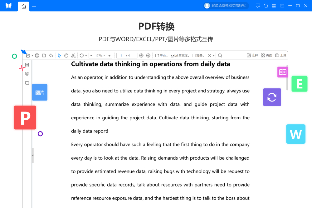 悦书PDF转换器,一款支持PDF转换和PDF操作的办公工具。 【强大的PDF文件转换】 支持PDF转Word、PDF转PPT、PDF转Excel、PDF转图片、Word转PDF、Excel转PDF、PPT转PDF、图片转PDF等 【丰富的PDF编辑功能】 支持PDF拆分合并、PDF压缩、PDF加密解密、PDF添加水印、PDF删除水印、PDF提取/删除页面等功能 所有功能操作非常简单,使用最新的超线程技术,转换效率特别高,所有功能支持多个PDF文件一键批量转换操作