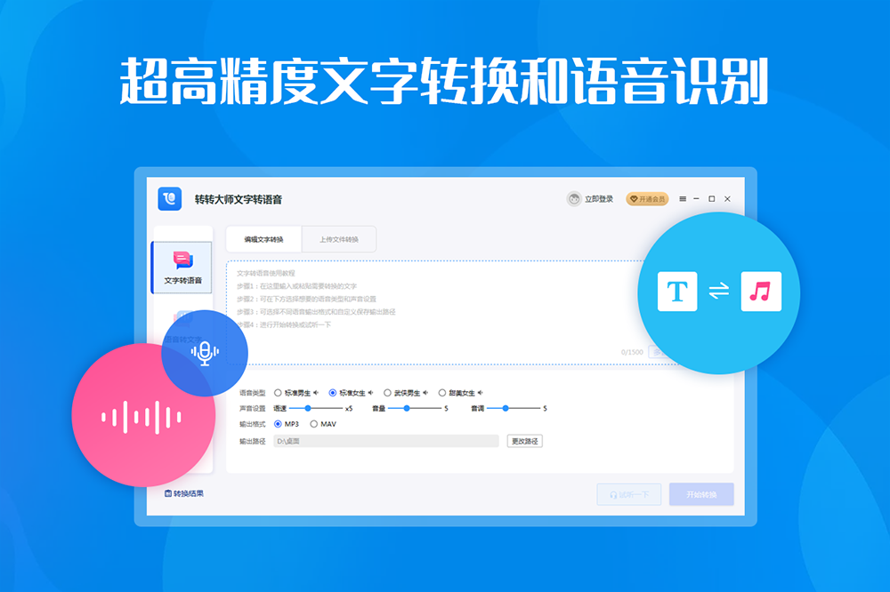 转转大师文字转语音是一款操作便捷,功能丰富的文字语音互转软件。不仅支持文字语音互转,还支持近百种语言互译,只需上传需要转换的文件,即可一键快捷转换,快速提高工作效率。