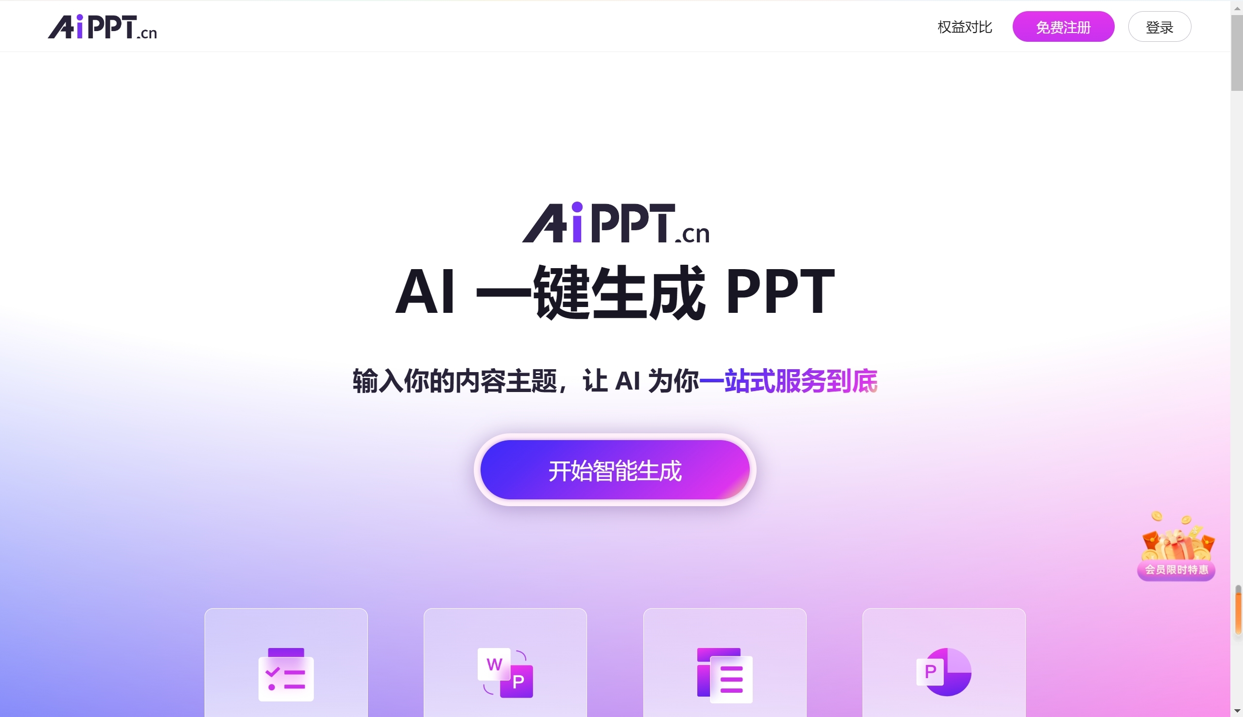 AiPPT 是一款AI驱动的 PPT 在线生成工具,帮助用户“一分钟一键生成 PPT”,无需复杂操作,只需要输入主题,AI 即可一键生成高质量 PPT,同时支持在线自定义编辑和文档导入生成,配置超10w+定制级 PPT 模板及素材,助力快速产出专业级PPT。