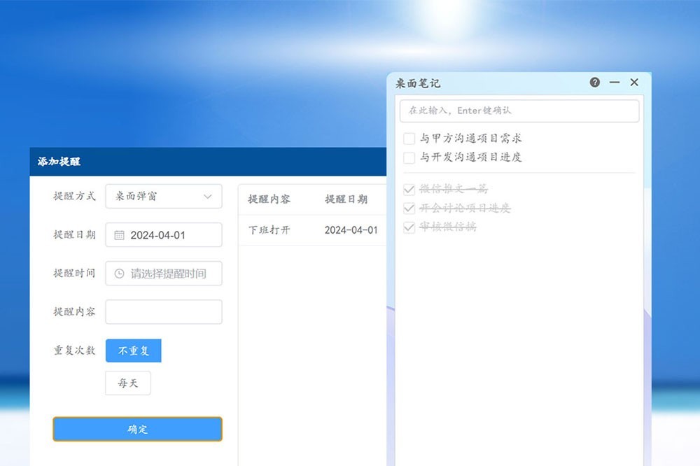 一款电脑端桌面应用软件,拥有记录待办事务,添加提醒等功能,方便用户记录和提醒工作中的事务。