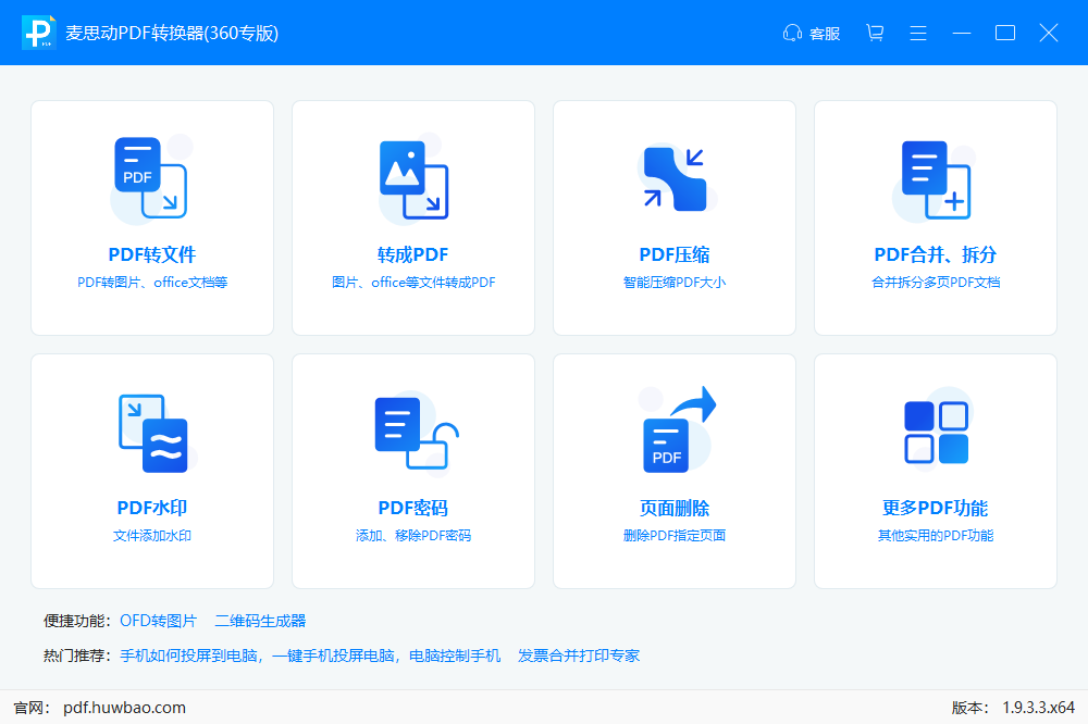 麦思动PDF转换器是一款功能强大的PDF处理工具,专为满足用户多样化的PDF文件管理需求而设计。该软件支持多种文件格式之间的相互转换,例如将PDF文件转换为图片、Office文档(如Word、Excel、PPT)、电子书等格式,同时也可以将这些格式的文件转换为PDF。用户可以轻松地将文档、图片整合成PDF报告,或将PDF文件拆分成单页图片文件。除此之外,麦思动PDF转换器还提供了PDF文件压缩、分割与合并、加密保护、添加水印等功能,帮助用户对PDF文档进行精细化管理。简洁直观的操作界面配合高效稳定的转换引擎,使得即使是技术新手也能够快速掌握使用方法,大大提高工作效率。无论是办公场景还是个人使用,麦思动PDF转换器都是理想的PDF处理伴侣。