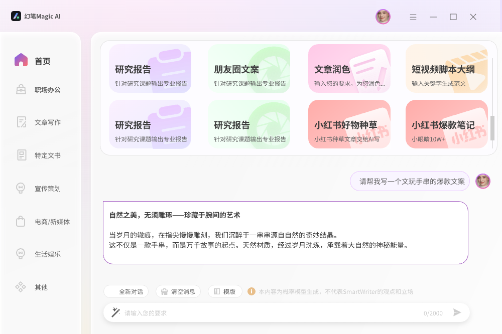 幻笔MagicAI,让沟通变得更加智能和高效!我们的AI聊天工具不仅能够实时理解并响应您的需求,还内置了多种固定模板功能,帮助您在常见场景下快速生成高质量的回复。无论是日常交流、知识问答,还是复杂的任务协助,都能提供贴心的支持。简洁的界面与强大的功能相结合,帮助您更快地获取信息、解决问题。立即体验,与智能对话助手一起开启高效沟通新篇章!