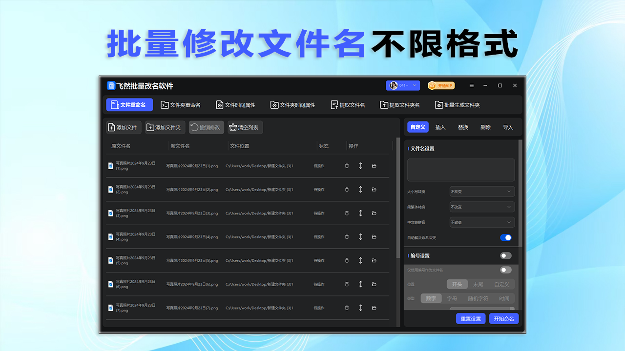 飞然批量改名软件支持批量修改文件名、批量提取文件名、批量新建文件夹、自定义文件编号。无论是替换指定字符,插入关键字词、按序号自动编号,自定义文件时间属性等;通过飞然批量改名软件可以让文件管理不再繁琐,提高工作效率,轻松应对各种需求极大地提高用户的批量重命名工作效率。